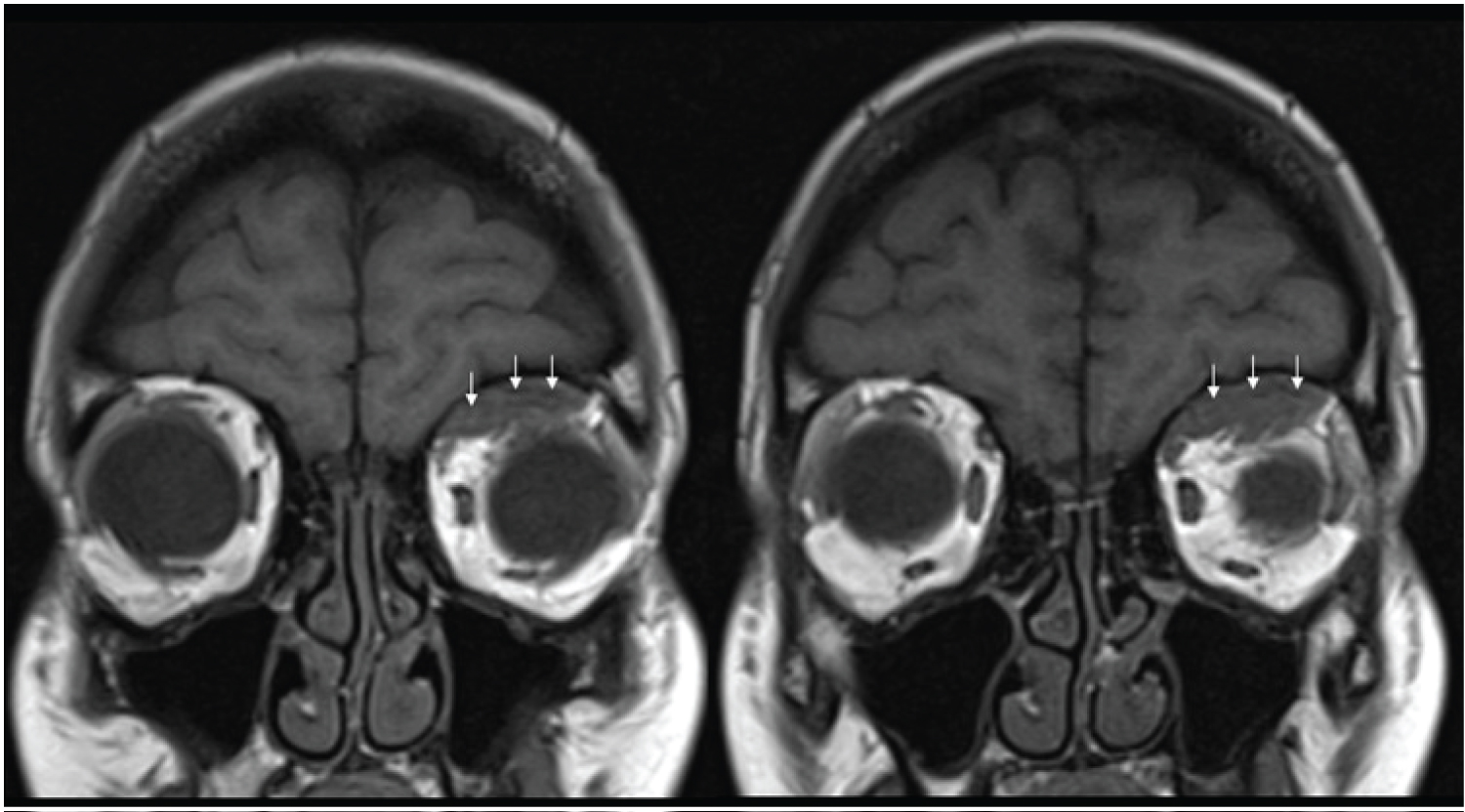 Figure 2: Hematoma on the left upper orbit (white arrows) on cranial MRI.