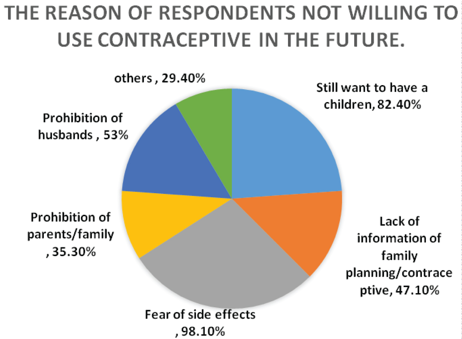 They mentioned there reason not to use contraceptive in the future 16(94.1%) were fear of side effects, followed by 14(82.4%) were still want to have a children and 8(47.1%) were lack of information about family planning (Figure 2).