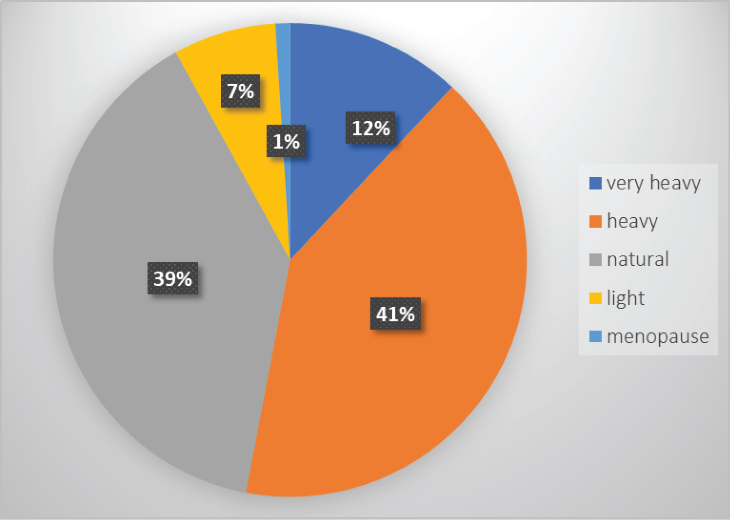 light 7%, normal 39%, heavy 41%, very heavy 12% in addition to one patient in menopause.