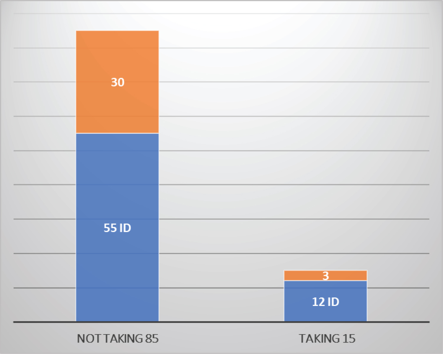 The study sample was divided into two groups according to the intake of antacids, and the percentage of those who are taking antacids was 15%, 12 of them were patients with iron deficiency anemia (80%) and it is considered high. It was found through a study that there is a relationship between taking antacids and ID, as the cause Iron deficiency is a decrease in iron absorption from the gastrointestinal tract with a decrease in gastric acid secretion due to the use of PPIs. As for the percentage of women who do not take antacids, 85% of them were 55 patients suffering from iron deficiency anemia (64%) (Figure 5).