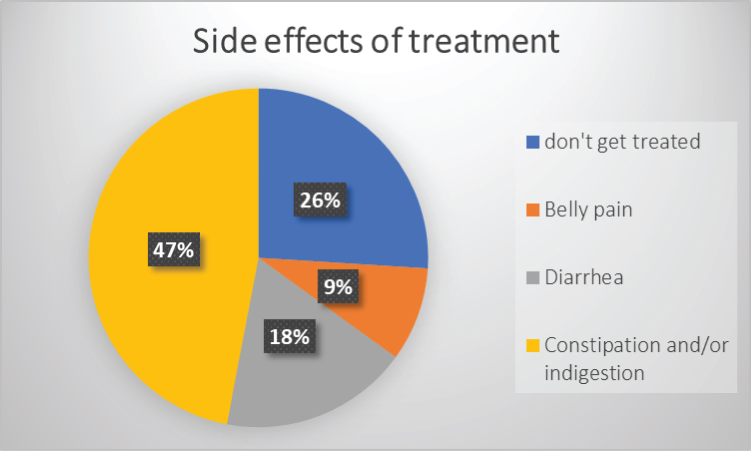 Orally treated patients were divided into 4 categories according to side effects: Constipation and/or indigestion, diarrhoea, abdominal pain, no symptoms.