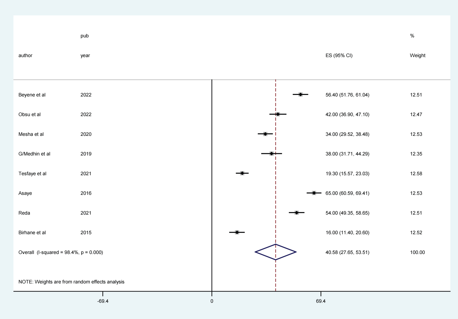 8 studies reported the prevalence of early implanon discontinuation in a total of 3,022 study participants. The pooled prevalence of early implanon discontinuation among implanon user in Ethiopia was found to be 39.78 (23.03, 56.53). Heterogeneity across the included studies was exhibited (I2 = 98.4%; p < 0.001) in estimating the pooled early discontinuation of implanon among implanon users. Hence, to estimate the pooled prevalence of early implanon discontinuation among implanon users, Random effect model was used during meta-analysis (Figure 2).