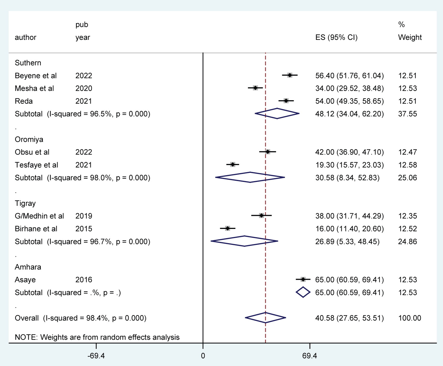 Figure 4: Subgroup analysis (by region) of studies included in meta-analysis on early Implanon discontinuation among Implanon users in Ethiopia, 2022.