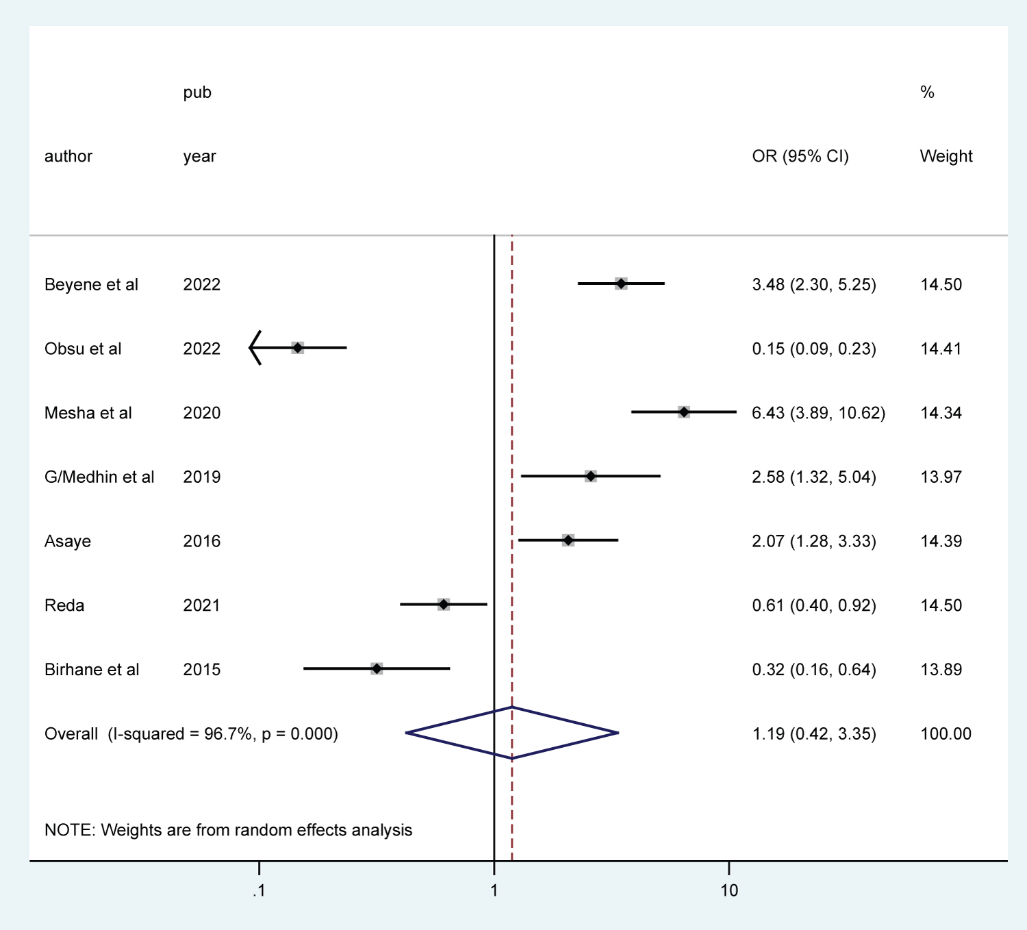 Seven studies indicated that developed side effect has a significant association with early implanon discontinuation. The odds of early implanon discontinuation were 1.96 times (AOR = 1.96; 95%CI: 0.42, 3.35) higher among implanon users who developed side effect when compared with those who hadn't developed side effect. In this meta-analysis, included studies were characterized with existence of heterogeneity (I2 = 96.7%, P < 0.001). Thus, random effect model analysis was used (Figure 5).