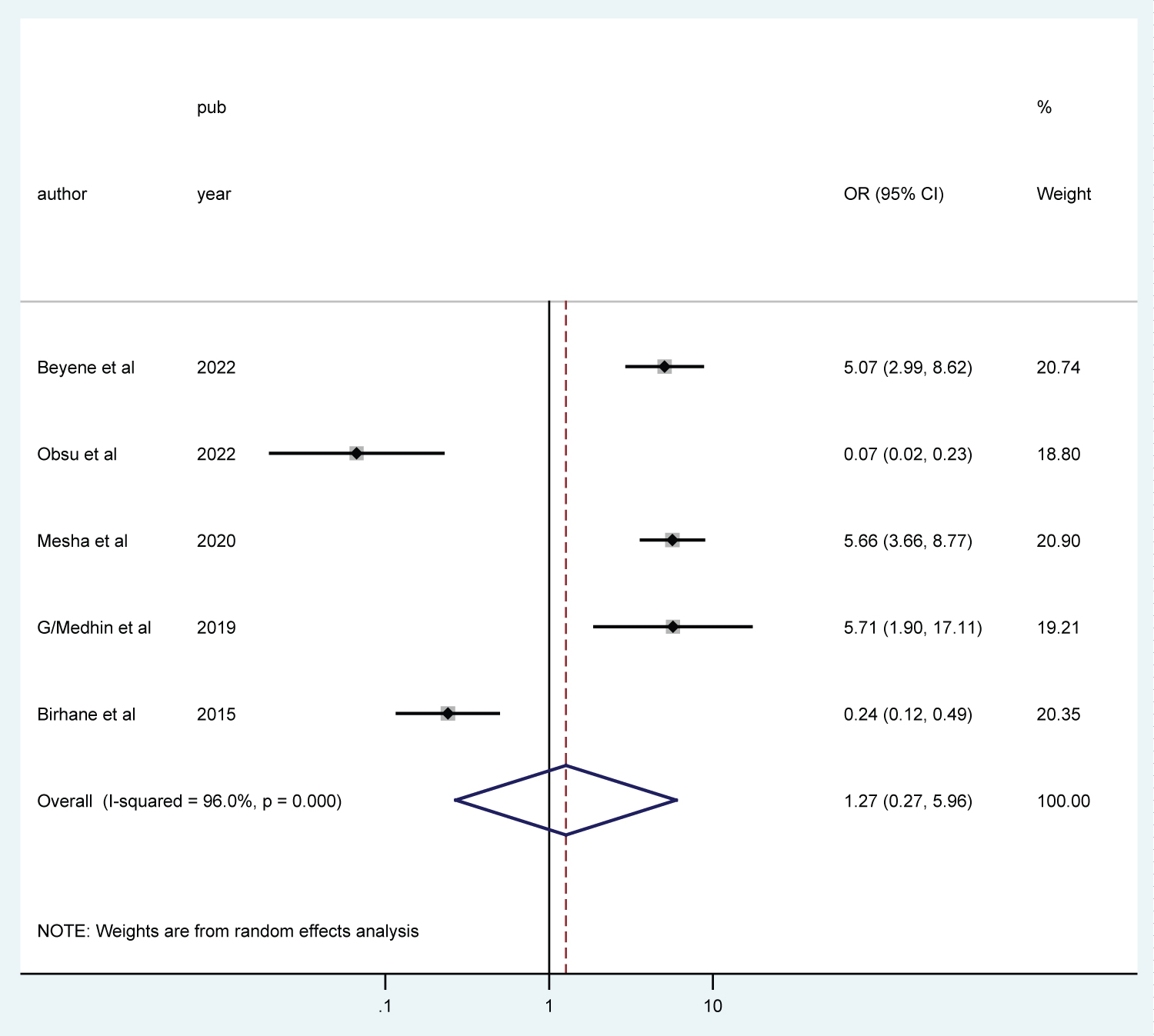 Five studies indicated that services dissatisfaction has a significant association with early implanon discontinuation. The odds of early implanon discontinuation were 1.27 (AOR = 1.27; 95%CI: 0.27, 5.96) higher among implanon users who experienced services dissatisfaction when compared with those who hadn't experienced services dissatisfaction. In this meta-analysis, included studies were characterized with existence of heterogeneity (I2 = 96%, P < 0.001). Thus, random effect model analysis was used (Figure 6).
