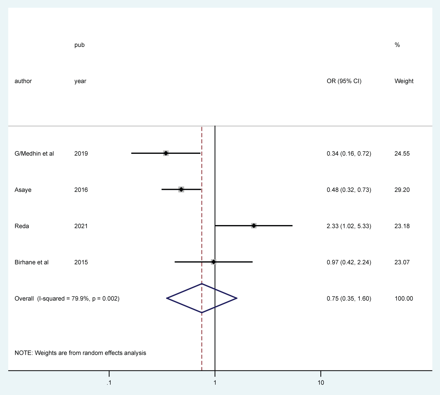 Furthermore, four studies indicated that pre-insertion counseling has a significant association with early implanon discontinuation. The odds of early implanon discontinuation were 0.75 times (AOR = 0.75; 95%CI: 0.35, 1.60) lower among implanon users who had pre-insertion counseling when compared with those who hadn't pre-insertion counseling. In this meta-analysis, included studies were characterized with existence of heterogeneity (I2 = 79.9%, P ≤ 0.002). Thus, random effect model analysis was used (Figure 8).