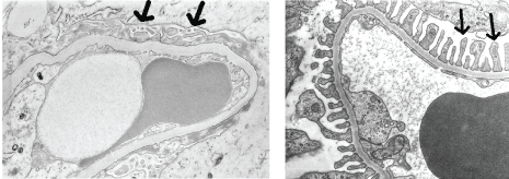 A week following the fourth dose of adalimumab the patient presented to the emergency department with complaints of edema of the scrotum, face, legs and feet. Initial laboratory work showed hypoalbuminemia of 1.2 g/dL, elevated creatinine of 1.3 mg/dL and urinalysis revealed a urine protein: creatinine ratio of 5.58 (urine protein: creatinine ratio in nephrotic syndrome is defined as being ≥ 3) [9]. The patient was also found to be hypertensive with systolic blood pressure over 150 mm Hg. A renal biopsy was performed. While glomeruli appeared normal under light microscopy (Figure 1), effacement of the foot processes was visualized under electron microscopy (Figure 2). Trace (scale 0-3) focal and segmental granular mesangial staining for IgM and trace to 1+ arteriolar staining for complement C3 were found. Also visualized with electron microscopy was focal trapping in glomeruli for complement C1q and tubular epithelial droplet staining for albumin. A lipid panel revealed hyperlipidemia with an elevated total cholesterol of 239 mg/dL, LDL of 158 mg/dL, VLDL of 43 mg/dL and triglycerides of 216 mg/dL. His HDL levels were normal at 38 mg/dL. With symptoms of proteinuria, hypoalbuminemia, edema, hyperlipidemia along with the electron microscopy findings above, the patient was diagnosed with minimal change nephrotic syndrome (MCNS).