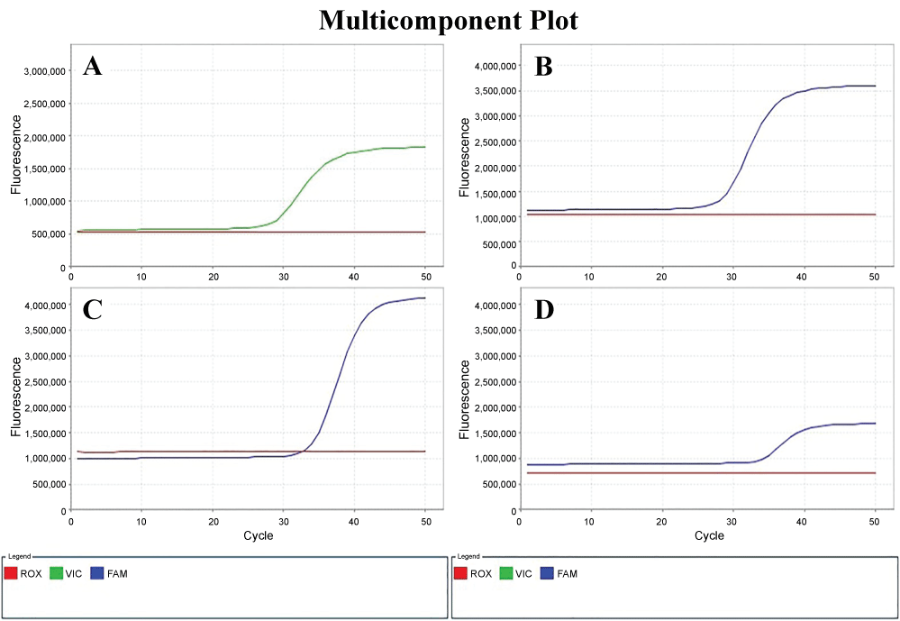 Figure 2: Amplification curves of β-actin labeling Yakima A) Yellow; B) Bax; C) Fas; D) Bcl-2 labeling FAM in the qRT-PCR.