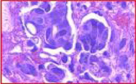 Figure 3: Cell block shows columnar epithelial fragments containing a few small clusters of cells with marked atypia characterized by atypical large cells, singly and in apparent small vascular channels, with large irregular nuclei, architectural distortion, and loss of polarity in a background of benign goblet cell metaplasia. View Figure 3