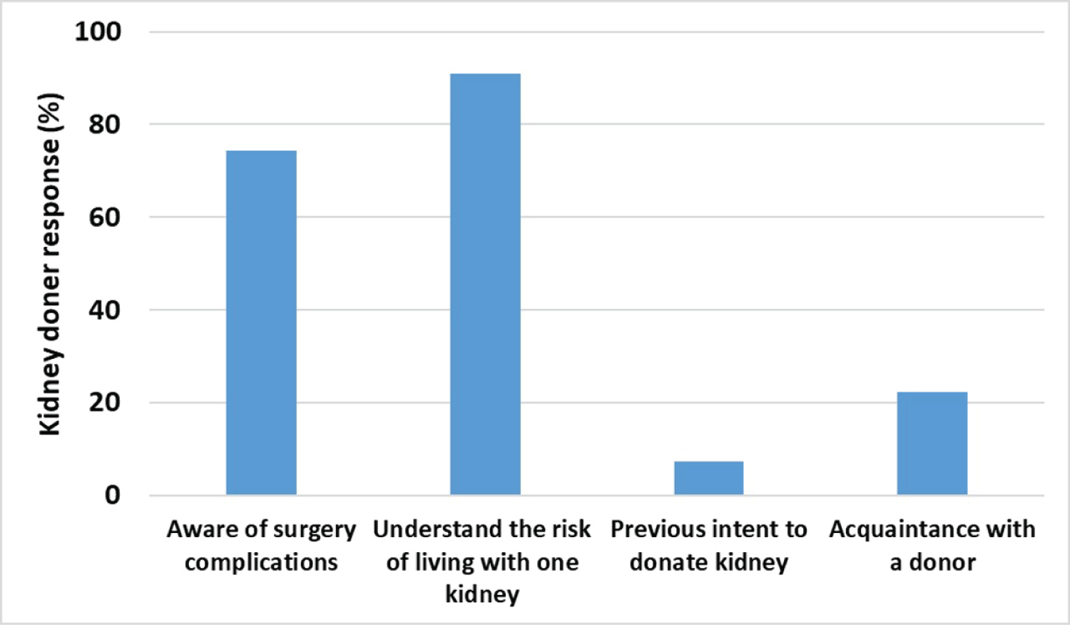 Among the approved recipients, 74.9% were first-degree relatives and 25.1% were second-degree relatives or friends. 44.0 of the beneficiaries, 44.0% were siblings, whereas 17.6%, 14.4%, and 9.6% were parents, nephews, nieces, and spouses, respectively. 89.8 of the respondents, 89.8% said they had not made any financial gain, 8.4% declined to answer, and 1.8% expected a reward. Figure 1 shows that 74.3% of the participants indicated that they were aware of postoperative difficulties, 91% reported being aware of living with a solitary kidney, 7.2% had previously attempted to donate their kidney, and 22.6% had contact with a healthy donor living with a single kidney.