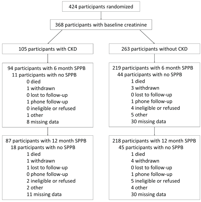 At baseline, participants were 70 to 89 years old, able to walk 400 meters unassisted in ≤ 15 minutes [21], sedentary, and scored ≤ 9 on the SPPB [20]. A total of 424 participants were followed for 12 to 18 months. To be eligible for this analysis, participants were required to have baseline data on serum creatinine and the SPPB.