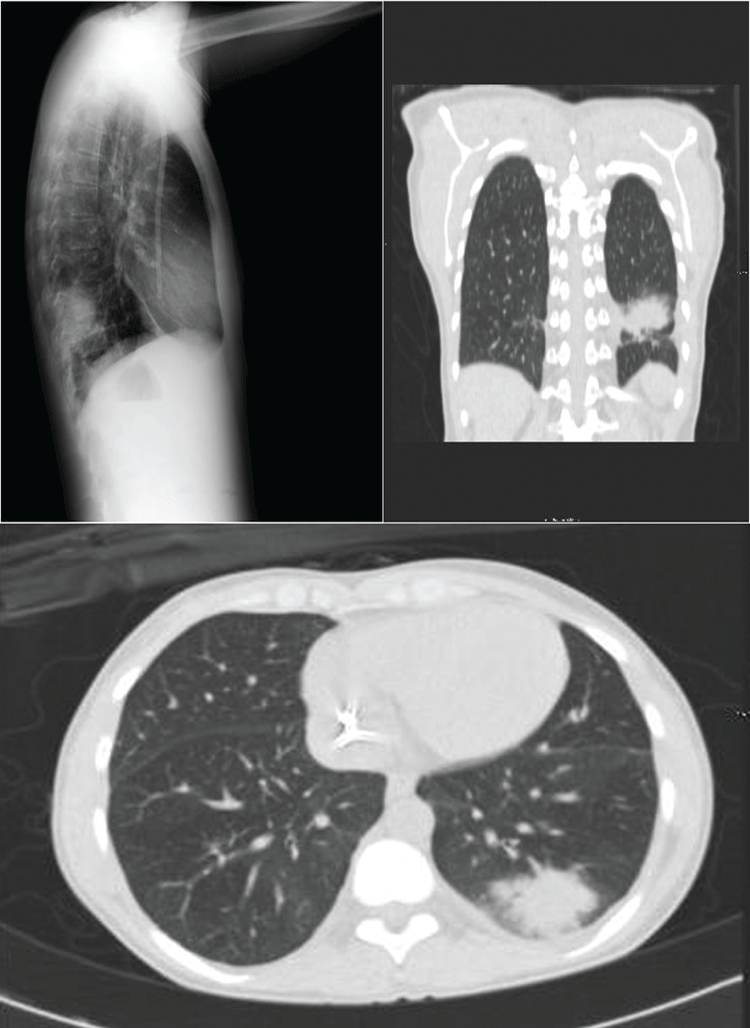 A 29-year-old woman with chronic kidney disease secondary to chronic interstitial nephropathy diagnosed by a kidney biopsy, in RRT with hemodialysis for 30 months using a right jugular tunneled catheter, began tacrolimus and prednisone treatment one week before hospital admission for a scheduled related kidney donor transplant. On admission, a simple chest X-ray showed a radiopaque image in the lower lobe of the left lung, confirmed by chest computerized tomography (CT) (Figure 1). An expanded study and empirical antibiotic treatment was decided in the absence of respiratory symptoms. Mycoplasma pneumoniae MIg was positive and Candida sp was detected in induced sputum after reviewing fluconazole and specific antibiotic treatment (the patient was discharged one month later). The kidney transplant (KT) was cancelled. CT was repeated six months later when the patient was asymptomatic. A reduction of the pseudo nodular consolidation in the posterior basal segment of the inferior lobe of the left lung (LIL) was observed, but with the presence of cavitated areas inside the consolidation. In addition, new ground-glass appearance injuries were detected in the right superior lobe (RSL), in the left superior lobe (LSL), the lingula and in both lung bases. Due to presence of fever and the radiological evidence the patient was readmitted for further study.