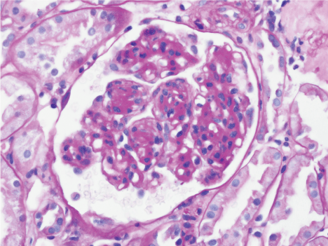 Figure 1: Glomerulus showing nodular expansion of the mesangial matrix (PAS stain, 400X). View Figure 1