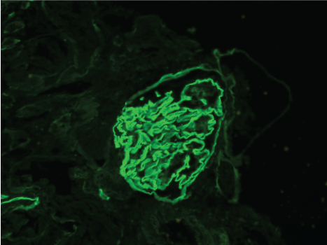 Figure 2: Glomerulus with linear IgG staining along the glomerular basement membrane (Immunofuorescence, 400X). View Figure 2