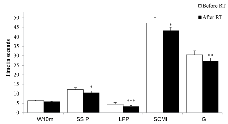 The data were expressed as the mean ± standard deviation (SD) or the median (Interquartile) when appropriate. Paired Student's t-test or the Wilcoxon test was used to compare the variables before and after RT. In the repeated measure ANOVA analysis, the Sidak post hoc was used. The differences were considered statistically significant when p < 0.05, and all the analyses were performed using SPSS 18.0 software for Windows (SPSS Inc., Chicago, USA).