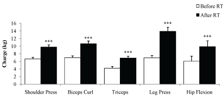 Figure 2: 1 maximum repetition test (1 MR) in Kg, performed before and after 12 weeks of RT. Paired Student's t-test. ***P < 0.001 vs. Before RT. View Figure 2