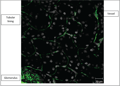 Figure 1: Confocal microscopy showing caveolin-1 staining (green) in a × 40 objective of the Zeiss confocal LSM 510 microscope image of a wild-type mouse kidney frozen section. Nuclei appear as grey with DAPI staining. View Figure 1