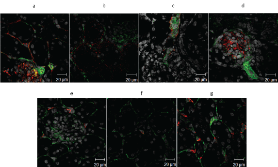 Figure 2: Confocal images of the wild-type non-injured kidney (× 63 objective of the Zeiss confocal LSM 510 microscope). Caveolin-1 (green) confocal images with red staining for a) CD31; b) E-cadherin; c) Alpha smooth muscle actin; d) Synaptopodin; e) CD45; f) CD3e; g) F4/80. Nuclei appear as grey with DAPI (4',6-diamidino-2-Phenylindole, dihydrochloride) staining. View Figure 2