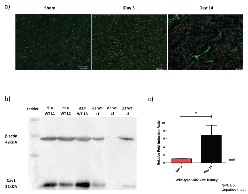 Figure 3: Caveolin-1 expression increases with length of UUO injury at day 3 and day 14. a) Confocal images of the wild-type UUO kidney (× 10 objective of the Zeiss confocal LSM 510 microscope); b) Representative Western blot of the Cav1 protein expression in relation to β actin in the left kidney; c) Relative fold induction ratio to sham for RT-qPCR of Cav1 mRNA.