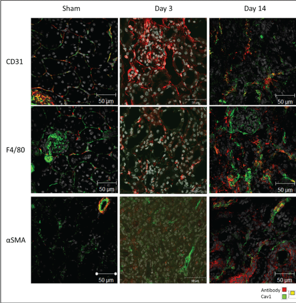 Cav1 co-localises with endothelial cells (CD31), especially in the glomerular endothelium, and its staining with vasculature (αSMA). Cav1 proximity to tubular epithelial cells (E-cadherin) and podocytes (synaptopodin) is also shown in Figure 2. αSMA is a marker of myofibroblasts that were not present in the non-injured kidney.