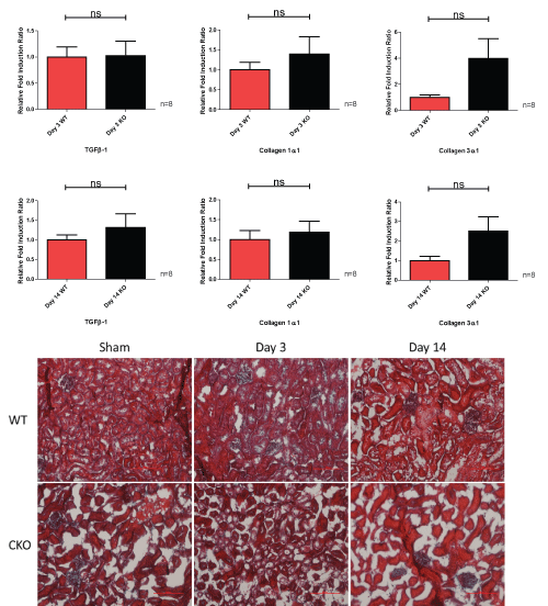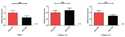 Sham operated wild-type and CKO mice did not significantly differ in the fold induction of TGFβ-1, collagen 1α1 or collagen 3α1 (Figure 6).