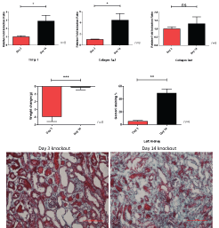 Figure 4: Relative fold induction change of TGFβ-1, collagen 1α1 and collagen 3α1 mRNA; b) Weight change; and c) Gomori stain for day 3 and day 14 injured wild-type UUO kidney.
