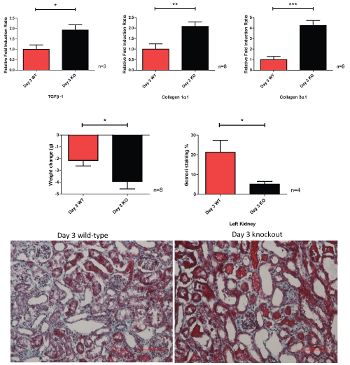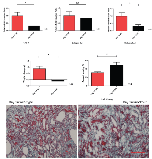 As compared to day 3, there is increased mRNA at day 14 for TGFβ-1, collagen 1α1 and collagen 3α1 in the wild-type left UUO injured kidney. The mice also exhibit a weight increase but similar percentage Gomori staining (Figure 4).
