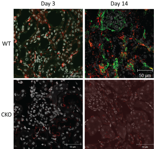The most striking difference with confocal microscopy between wild-type and CKO groups is the amount of F4/80 positive cells staining seen as the model progresses with time. There is a greater number of F4/80 cells staining This staining is more visible in the wild-type than CKO group (Figure 10).