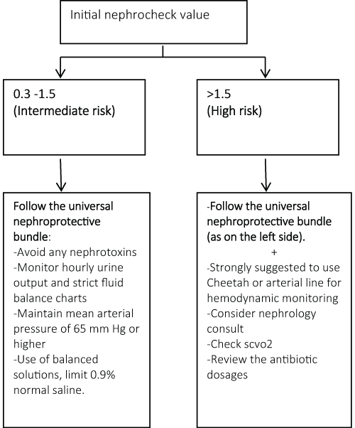 Using the Nephrocheck® kit, a feasibility study was performed to see if this test kit helped to identify patients with severe sepsis, septic shock, or respiratory failure at high risk to develop AKI. Those who were identified at risk where intervened on while these patients still normal kidney function by instituting a renal protective management bundle ("nephroprotective bundle") to prevent further development of AKI.