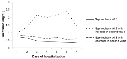 An initial Nephrocheck® value ≥ 0.3 was significantly associated with development of AKI (p = 0.03). However, patients with initial values of ≥ 0.3 who had a decrease in the subsequent value at 24 hours did not develop AKI and therefore behaved similarly to patients with a low initial Nephrocheck® value of < 0.3. Figure 3 shows the creatinine trends in the first 7 days in the groups with initial Nephrocheck® value < 0.3, initial Nephrocheck® value ≥ 0.3 with a decrease in second value at 24 hours, and initial Nephrocheck® ≥ 0.3 with an increase in second Nephrocheck® value at 24 hours.
