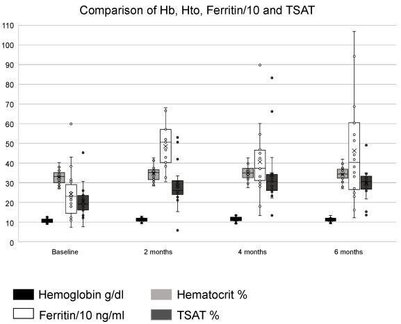 Figure 1: Comparison of hemoglobin (Hb), hematocrit, ferritin, and transferrin saturation (TSAT) at baseline, 2, 4 and 6 months. View Figure 1