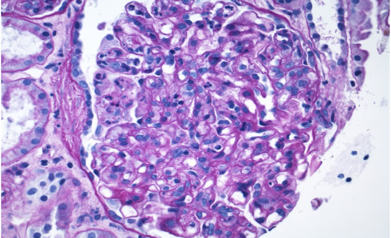 Figure 2: Kidney biopsy sections demonstrated cryoglobulinemic glomerulonephritis with hyaline pseudothrombi, and membranoproliferative glomerulonephritis injury pattern (x400, H&E stain).