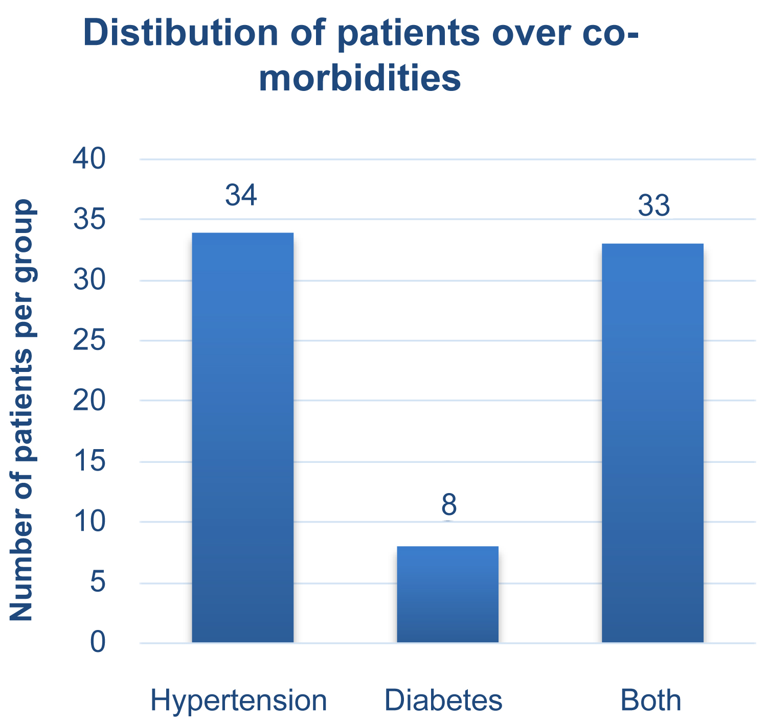 The presence of diabetes alone, was found in 10 (8%) patients, hypertension only was found in 34 (28%) patients, while both hypertension and diabetes were found in 33 (28%) subjects. No diabetes or hypertension was present in 43 patients (35.8%) as shown in Figure 1. The mean cystatin values were higher in the males as compared with the females and were higher for the older groups of people.