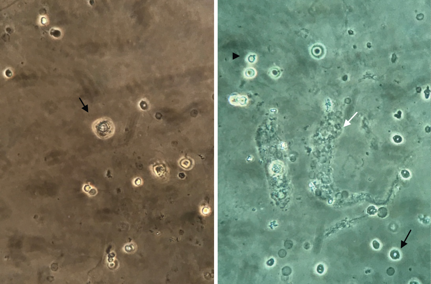Figure 1: Urine microscopy (400x). (A) Renal tubular epithelial cell; (B) Erythrocyte cast (white arrow), dysmorphic glomerular erythrocytes (black arrow) and acanthocyte (arrow head).