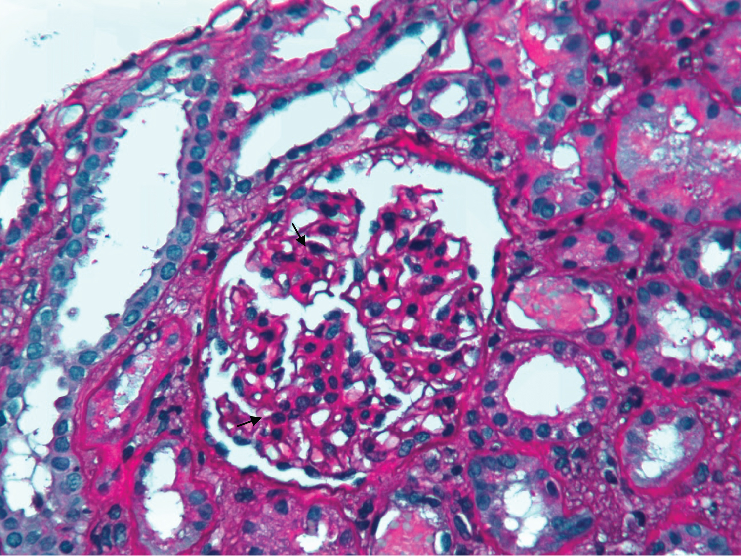 Figure 2: PAS x 400 - Slight mesangial expansion and proliferation on glomeruli (black arrows) and acute tubular necrosis foci (white arrow).