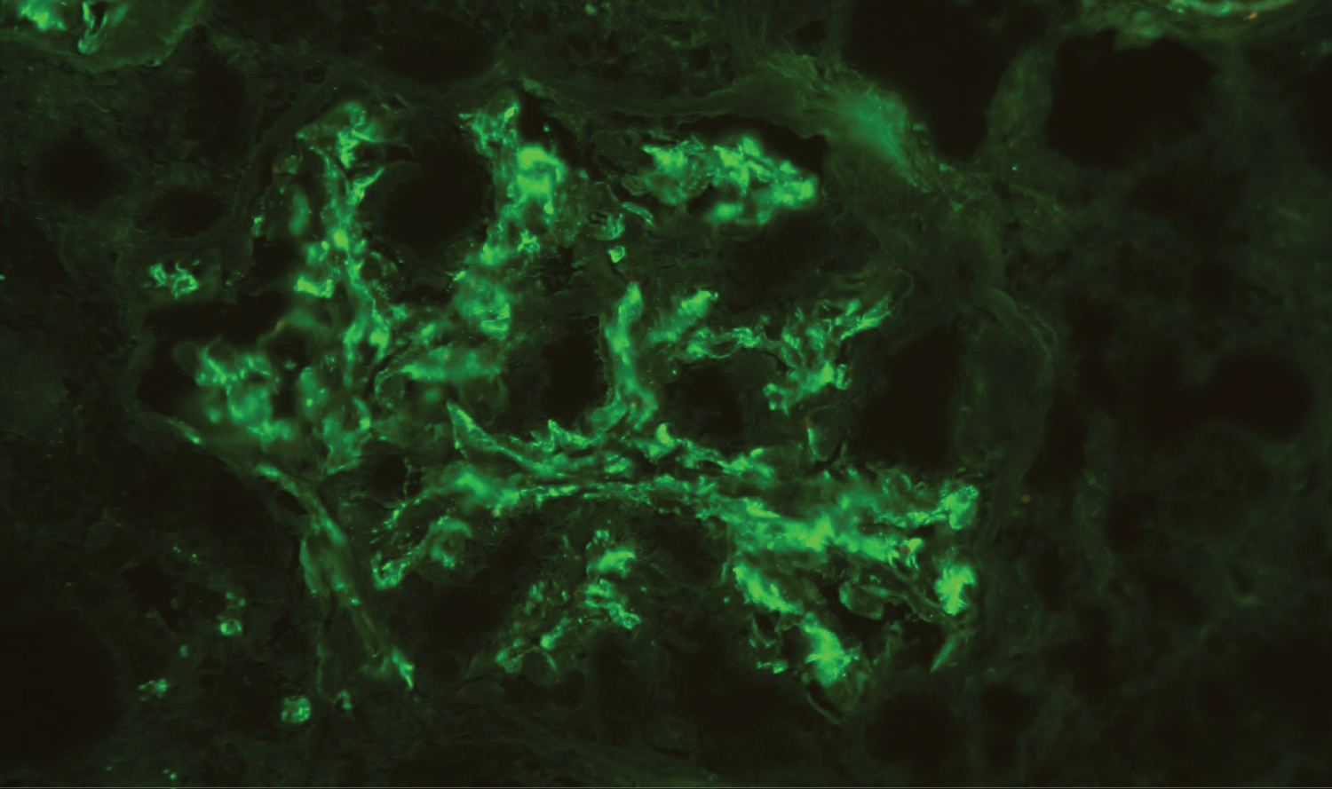 He was admitted for progressive anorexia, malaise and peripheral edema with one month of evolution. His vital signs were normal and besides bilateral peripheral edema, physical examination was unremarkable. Complementary tests revealed anemia (hemoglobin 10.7 g/dL) and acute kidney injury (AKI) (sCr 2.4 mg/dL) and the patient was transferred to the Nephrology Department for pursuing study. Additional study showed elevated erythrocyte sedimentation rate (102 mm/hour) and serum immunoglobulin (Ig) A (6,06 g/L; RV < 4.00); serum circulating immunocomplexes (89.31 RU/mL; RV < 20); mixed alkalosis and hypokalemia on arterial blood gas (pH 7.503, pCO2 26.2 mmHg, HCO3 22.9 mmHg, K 3.2 mEq/dL); urinary protein-to-creatinine ratio of 237 mg/g, urine specific gravity of 1,008 and leukoerythrocyturia on urinalysis (377/uL and 106/uL, respectively). Urinary sediment showed abundant dysmorphic erythrocytes (RBCs) and RBC casts under microscopy, with lipiduria and renal tubular epithelial cells (Figure 1). Further study, including monoclonal, polyclonal and infectious panel, was negative. Renal ultrasound excluded urinary calculi or obstruction. A kidney biopsy was performed. Under light microscopy, glomeruli revealed slight mesangial expansion and proliferation (Figure 2). The interstitial compartment showed mild mononuclear interstitial inflammatory infiltrate and fibrosis involving about 30% of the biopsy fragment (Figure 3). There was also acute tubular necrosis foci and tubular hematuria. No interstitial granulomas or crystal clefts were found. Congo red staining for amyloid was negative. Direct immunofluorescence examination of frozen renal tissue demonstrated mesangial deposits positive for IgA (++) and C3 (++) (Figure 4). These findings were consistent with interstitial nephritis due to salicylates and IgA nephropathy secondary to UC.