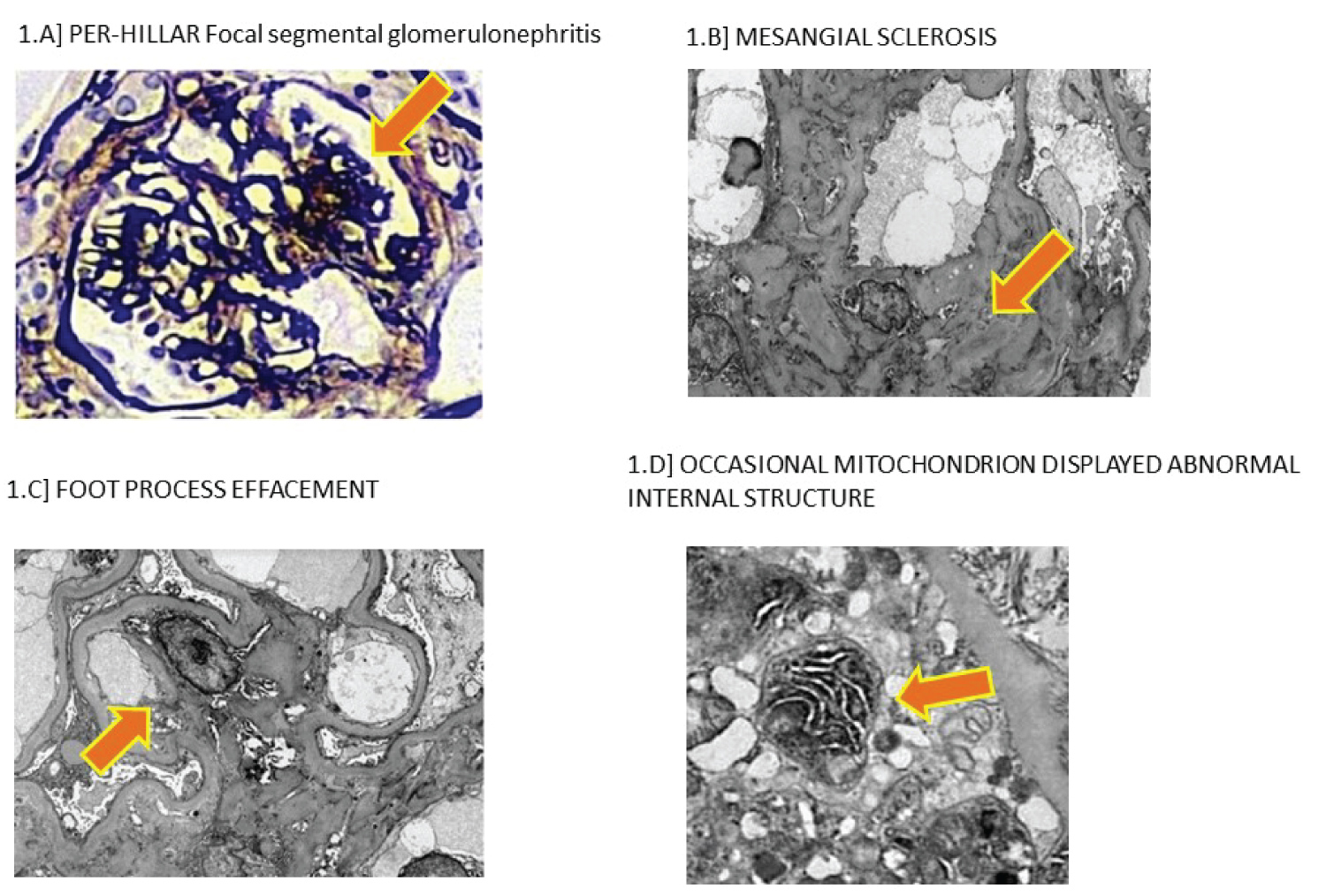 Figure 1: Renal Biopsy Histopathology: A) PER-hillar focal segmental glomerulonephritis, B) Mesangial sclerosis, C) Foot process effacement, and D) Occasional mitochondrion displayed abnormal internal structure.