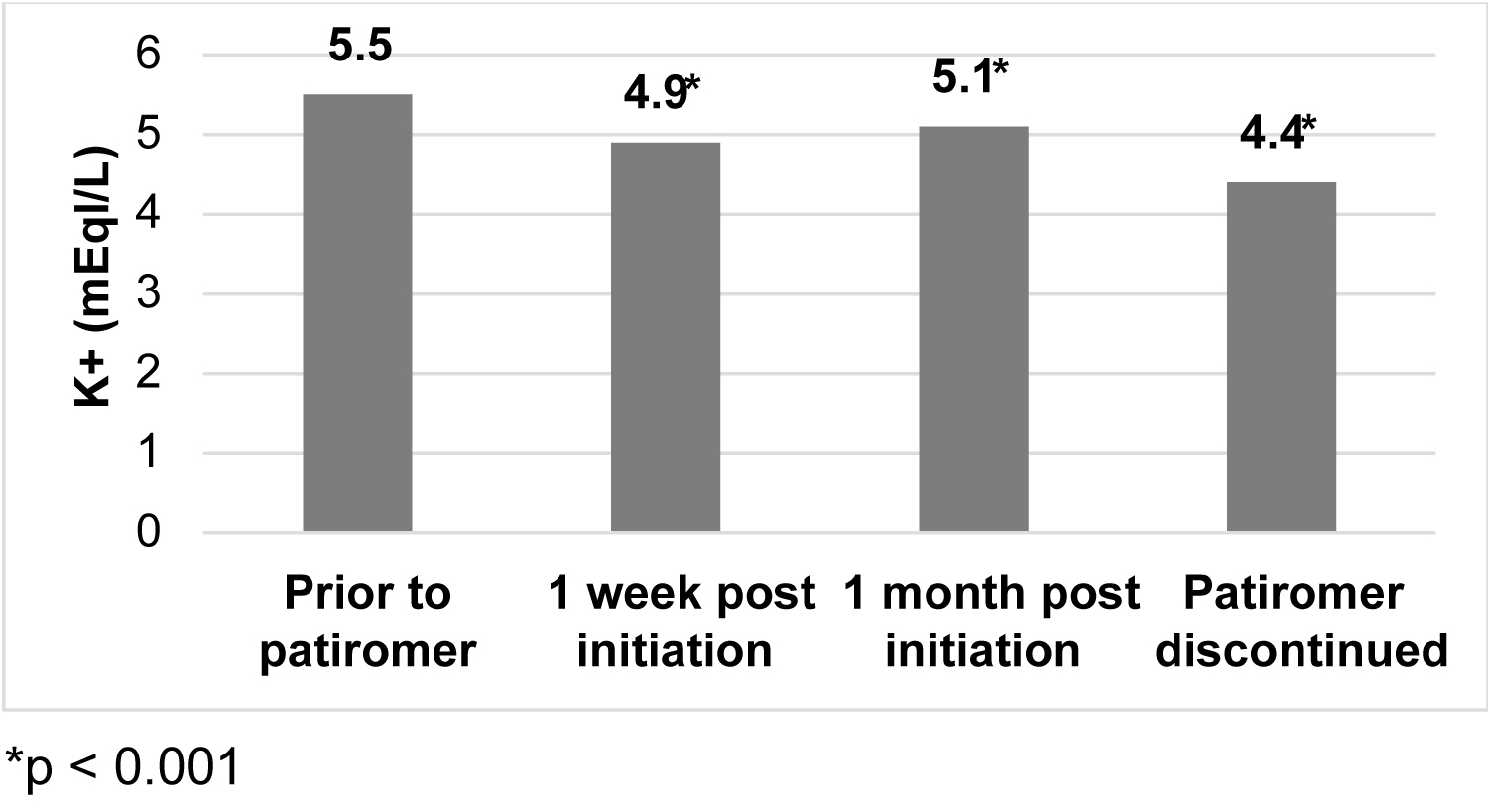 Mean serum potassium levels over the course of patiromer therapy are shown in Figure 1. Potassium (mEq/L) significantly decreased from time of initiation of patiromer compared with 1 week and 1 month later, and at discontinuation of therapy (5.5 ± 0.4, 4.9 ± 0.5, 5.1 ± 0.5, 4.4 ± 0.5, p = 0.001). Serum creatinine (μmol/L) was not significantly different prior to patiromer initiation compared to 1 week later or at discontinuation of patiromer (2.1 ± 0.2, 1.8 ± 1.4, 1.8 ± 0.9; p = 0.3, p = 0.7). Serum magnesium (mEq/L) (1.8 ± 0.35, 1.7 ± 0.2, 1.7 ± 0.2; p = 0.2) and calcium (mEq/L) (9.3 ± 0.65, 9.4 ± 0.7, 9.3 ± 0.8; p = 0.7) were similarly unchanged before, during and after patiromer therapy.