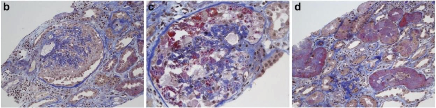 Figure 1: Light microscopy study (Masson's trichrome stain, original magnification [b,d]*200 and [c]*400) showed the following: First, a severe collapsing glomerulopathy (focal segmental glomerulosclerosis) characterized by (b,c) the global collapse of shrinking capillary loops and the detachment from the basement membrane of (b) hypertrophic, proliferating podocytes (or "cobble stone pattern"), which contained numerous (c) protein reabsorption vacuoles. (d) Second, acute tubular lesions with focal tubular necrosis, dilatation, and the presence of intratubular reabsorption vacuoles.