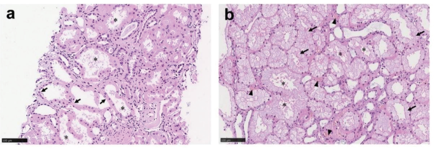 In the proximal tubule, we can see acute tubular necrosis which is manifested as a loss of the brush border (Figure 2a), vacuolar degeneration, and dilation of the tubular lumen with cellular debris (Figure 2b). Hemosiderin in the tubular epithelium may also be present in patients with hematuria. The distal tubule and collecting ducts may show occasional swelling and edematous expansion of the interstitial space.