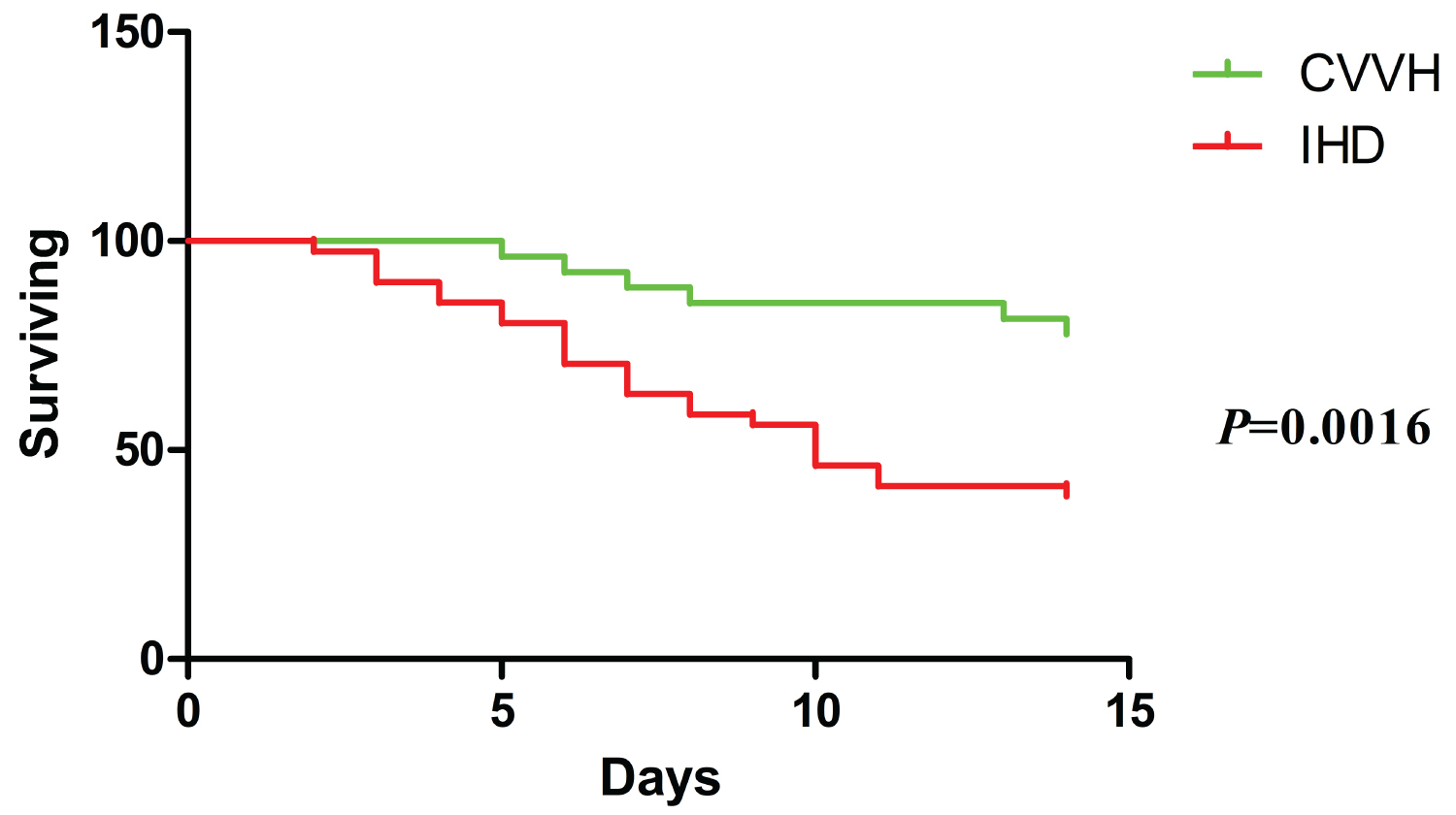 Figure 1: Kaplan-Meier analysis of patients with AMI at 14 days comparing survival of patients receiving CVVH to IHD. AMI: Acute Myocardial Infarction; CVVH: Continuous Venovenous Hemofiltration; IHD: Intermittent Hemodialysis.