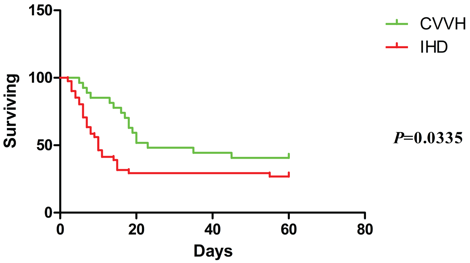 When comparing patients treated with CVVH versus IHD, there was a statistically significant difference in survival at 14 days (22.22% vs. 60.98%, P = 0.0016), 30 days (51.85% vs. 70.73%, P = 0.0183) and 60 days (59.26% vs. 73.17%, P = 0.0335) (Figure 1, Figure 2 and Figure 3). Logistic regression analysis further confirmed that the choice of first dialysis modality after AMI had a significant impact on the 14 days survival rate. Compared with CVVH, continuing to use IHD modality during the first dialysis session after AMI could increase the risk of death for hemodialysis patients within 14 days after the onset of AMI by 4.2 times (OR, 5.209; 95% CI, 4.6 to 6.0; P < 0.001). In addition, the age of the patient and the hemoglobin level at the time of AMI onset also had a significant impact on the 14 day survival rate. For every year of age increase, the risk of death within 14 days after the onset of AMI increased by 3.2%, while for every 10 g/L increase in hemoglobin, the risk of death within 14 days after the onset of AMI was reduced by 7%. No significant impacts of dialysis age or albumin level on short-term survival were found in this study (Table 2).