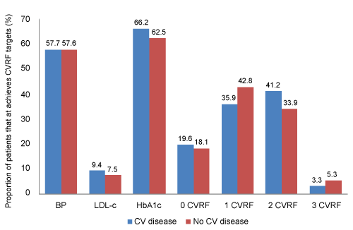 • CV risk factors control rates were similar among patients with CVD and those without CVD.