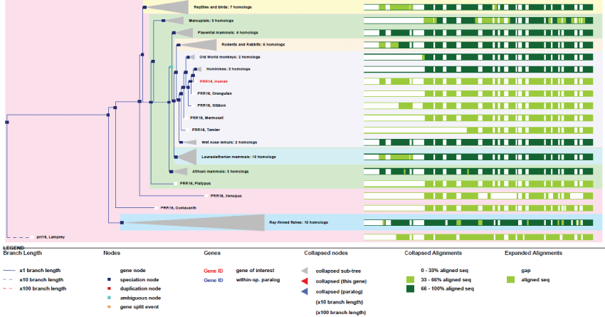PRR16 is a unique gene present on chromosome 5. It contains 2 exons and produces 5 transcripts. The gene is not present in yeast nor in drosophila as it appeared late in higher eukaryotes. It is present in the common ancestor of chordates.