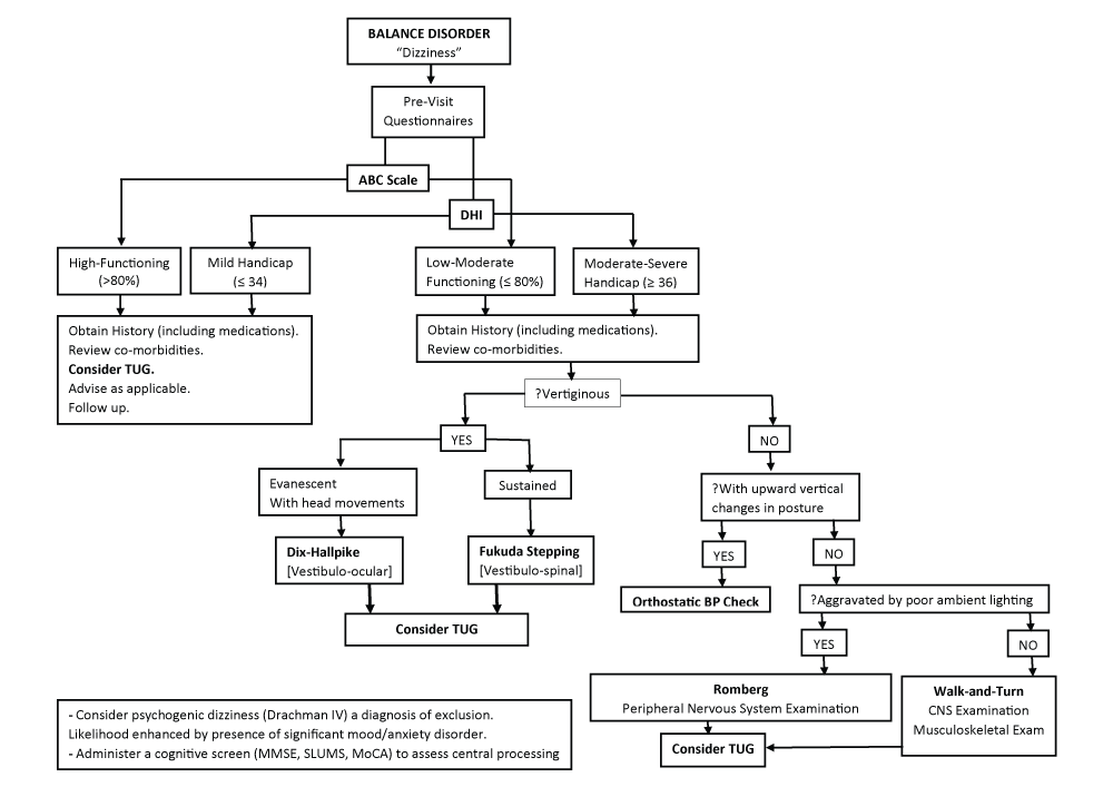 The pre-visit questionnaires (ABC scale, DHI) evaluate the impact of balance impairment on the daily life of the patient. It is important for this to be determined since arguably, the best index of symptom severity is the degree of functional limitation associated with it.