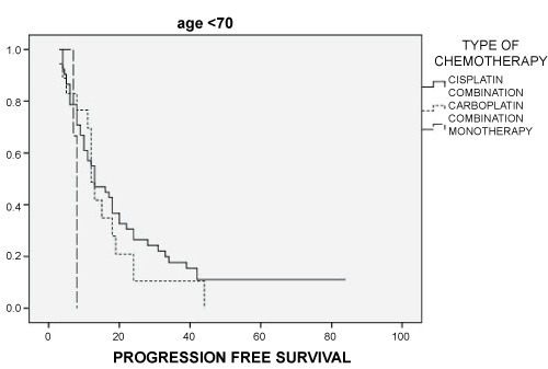 Results: 120 patients were analyzed; 73 young (60%), 47 elders (40%). Cisplatin-combination were mainly used in the young group (71% vs. 8%, p: 0.0001). Elders received more carboplatin-combination and monotherapy. Chemotherapy-schedule had not had an impact on survival in any age group. Median progression free survival (PFS) was similar for both groups: 13.0 (95% CI: 11.2-214.7) vs.11.0 (95% CI: 7.7-14.2) months (p: 0.519). Overall Survival (OS) did not differ by age groups: 18.0 (95% CI: 13.1-22.9) vs. 18.0 (95% CI: 12.8-23.1) months (p: 0.393). OS at 2-years was 20% and 10% at 5-years in both groups. The only therapeutic predictive factor for outcome (OS) was median radiotherapy dose (> 50 Gy).
