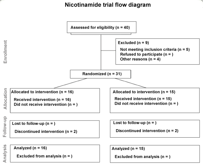Conclusions: This study failed to demonstrate that extended-release NA, or vitamin B3, improves cognitive function in subjects with mild to moderate AD over 24 weeks. The lack of efficacy of NA may have been due to several contributing factors including a low sample size, inclusion of subjects with moderate AD, and a relatively short treatment phase. The results also show that high dose NA is relatively safe in elderly subjects with AD. With the current emphasis on the early diagnosis and treatment of AD, a longer duration of treatment with NA in subjects with preclinical AD and/or mild cognitive impairment (MCI) may be warranted.