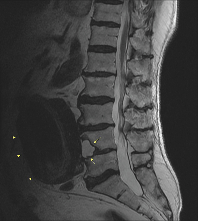 Figure 1: A 71-year-old man, mid-sagittal T2W FSE lumbar MRI image shows sclerotic margin -nonexpansive- hyperintense cyst in L4 vertebral body (long arrows). Giant abdominal aortic aneurysm is also seen adjacent to the anterior margin of L4 vertebra (arrow head).