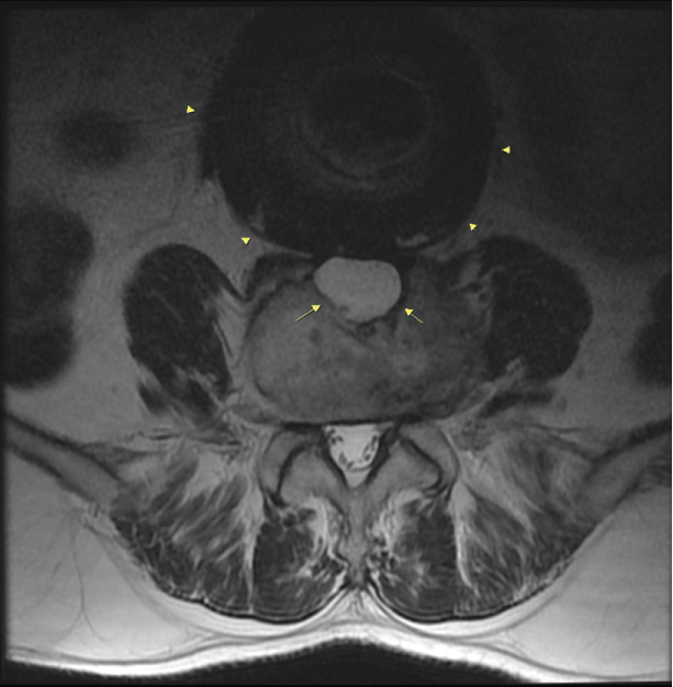 Figure 2: Axial T2W FSE lumbar MRI image: The vertebral cyst (long arrow) is seen adjacent to the aortic aneurysm (arrowhead).