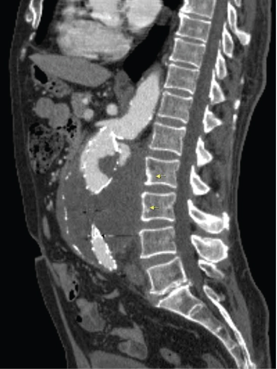 Figure 3: A 80-year-old man, operated abdominal aortic aneurysm. Sagittal reformate CT image: Aortic aneurysm with diameter of 85 mm and erosion at the anterior corpus of the adjacent vertebra (L2) is seen (long arrow).